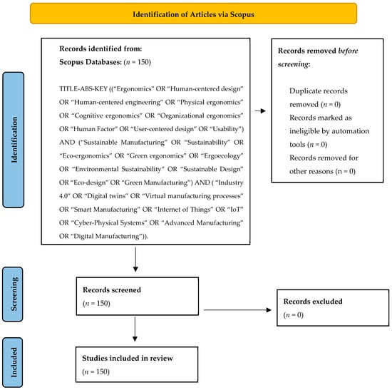 Articles that, despite being pertinent to ergonomics, human factors, or sustainable manufacturing, veered off in other directions or did not specifically address the integration of ergonomics and human factors in sustainable manufacturing were not included. Data extraction involved a detailed analysis of the selected papers. This information was then organized and combined to find recurrent themes, patterns, and consistencies within the different articles. Additionally, each article’s important conclusions and deductions were briefly summarized, offering a thorough overview of the body of knowledge. Figure 1 shows the PRISMA flow diagram which depicts how the data were identified, screened, and included.
