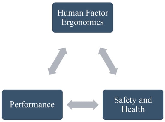 The terms “human factors” and “ergonomics” have been used interchangeably while ergonomics is a broader field that includes physical, cognitive, and organizational aspects of work and life, and human factors are considered a subset of ergonomics, focusing on the psychological and physiological aspects of human performance and behavior in relation to design []. However, HFE refers to a distinct and interrelated field of study that concentrates on the human–artifact nature and interaction by taking into account the design, science, technology, engineering, and management of human-compatible systems, which include a range of artificial and natural commodities involving processes and living environments []. HFE is concerned with the mechanisms that enable human interaction with environmental factors. The environmental factors are multifaceted and comprise the social environment (other individuals, society), the environment of the organization (the control and management of various activities), and the physical environment (objects) []. Nowadays, ergonomics is a well-established subject that includes experts from several fields collaborating to build sociotechnical systems to adapt them to human requirements and well-being. It is understood from the perspective of manufacturing businesses that any sophisticated technology system involving humans is incredibly reliant on the social and organizational context in which it functions. The goal is to make sure systems are designed and planned in a manner that maximizes the role of humans in production to minimize the possibility of design-related risks to well-being, process or personal safety, or the overall environment.