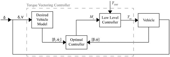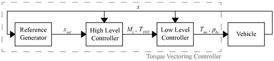 This section presents in detail the three main components that constitute torque vectoring controllers, making reference to the approaches employed in a wide range of the literature. To focus on the control strategy, all vehicle states are assumed to be available to the controller, and the state estimation issue is not addressed in this paper. This assumption is significant since, in the context of passenger vehicles, crucial quantities like vehicle sideslip angle or tire–road contact forces and friction coefficient are not directly measurable but require estimation. A comprehensive overview of techniques and approaches for tire and vehicle state estimation can be found in [,,,], where an exhaustive literature review is provided.