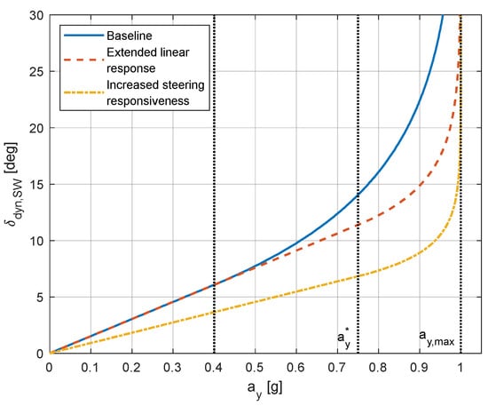 where represents the vehicle mass, and denote the distances between the vehicle center of mass and the front and rear axle, respectively, and and are the cornering stiffnesses of the front and rear axle, respectively. This approach enables the manipulation of the vehicle’s cornering response by acting on the understeering coefficient (). However, the linear nature of this approach for the reference yaw rate has limitations due to the inherent linearization and is thus effective within the linear region of tires (typically below 4 m/s2 lateral acceleration). Notably, this method does not account for tire–road friction, which physically restricts the maximum attainable yaw rate. To address this limitation, a more sophisticated approach is introduced, allowing for a detailed design of the reference understeer characteristic [,,,,,,,,,,,,,,]. In relation to that, a piecewise function defines the relationship between the dynamic steering angle and the lateral acceleration , which, under quasi-steady-state conditions, is directly associated with the reference yaw rate (). This approach originates from defining the steering angle as the sum of dynamic and kinematic components, with the latter obtained from the Ackermann formula, as in the following: