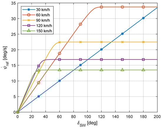 where all the mentioned quantities are already known. When following the presented approach, it is crucial to consider that the maximum vehicle acceleration is constrained by the available tire–road friction. Consequently, a longitudinal acceleration results in a reduction in the maximum attainable lateral acceleration. Thus, the yaw rate reference () can be derived as the function of steering wheel angle input (), vehicle speed () and longitudinal acceleration (), as illustrated in Figure 3.