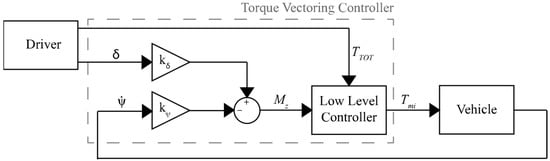 In [], a TV proportional (P) controller, based on a linearized single-track vehicle model, is proposed. The control strategy draws from previous studies on vehicle lateral dynamics control where the control input was the steering angle [,,]. The controller comprises a feedforward part proportional to the steering angle () and a feedback part proportional to the yaw rate (), as schematized in Figure 4. The feedback gain is designed to obtain a damping ratio that is independent of vehicle speed, while the feedforward gain is designed to achieve a null steady-state value of the vehicle sideslip angle. The desired yaw moment () is then actuated by defining individual motor torques () through a low-level controller, also accounting for the total driving torque () required by the driver.