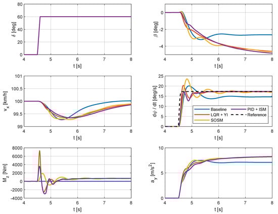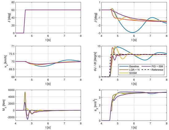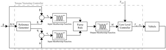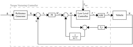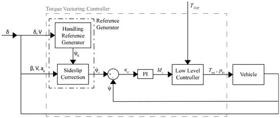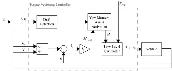 Torque vectoring is widely regarded as an effective tool in improving vehicle dynamics, prompting the design of controllers that also address uncommon road-driving situations. In [], a controller assisting the driver during drift maneuvers is proposed by imposing an appropriate yaw moment through torque vectoring at the rear axle, according to the scheme of Figure 8. To define a suitable control strategy, the effects of steering angle, gas pedal and torque vectoring on vehicle lateral dynamics were studied. The steering wheel angle has a strong influence in all driving conditions, with the gas pedal having comparable effects only in drifting conditions, and torque vectoring being able to control the yaw rate in any condition. This analysis explains why, instead of modifying driver inputs like steering angle and gas pedal, it is better to assist him by using torque vectoring. The yaw moment generated by the controller is proportional to the yaw index (YI) as in [], and it is activated only when the drift condition is detected, meaning a precise series of inputs coming from the driver related to the actual vehicle yaw rate. Trying to minimize the value of the yaw index, as done here, means trying to maintain the vehicle close to steady-state cornering, or equivalently, to prevent excessive increases in lateral velocity. In fact, the yaw index () is defined as follows: