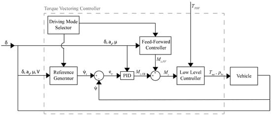 The high-level controller takes as input the driver commands, the vehicle states and the output quantities from the reference generator. These inputs then define the total driving torque () and yaw moment () to be applied to the vehicle. Two parallel logics generally compute the two outputs of the high-level controller. The total torque demand is obtained through a drivability controller, while the yaw moment is obtained through the torque vectoring controller. The drivability controller uses drivability maps to define the amount of total driving torque to be delivered to the wheels to fulfill the driver demands, i.e., the accelerator pedal position is converted into a total torque reference for the engine or the motors. Instead, the torque vectoring controller computes the total desired yaw moment to be applied to the vehicle according to various approaches. The simplest method consists in a Proportional–Integral–Derivative (PID) controller [,,] based on the error between the reference and the actual value of the yaw rate and/or sideslip angle. Alternatively, optimal controllers can be used to track state references [,]. This approach generally requires a reliable vehicle model, which allows it to outperform the simple PID approach. Conversely to optimal approaches, it is possible to mention Sliding Mode Control (SMC) [,] or also fuzzy logic control [,]. Through the years, Model Predictive Control (MPC) [,] has also become widespread thanks to the improved computational capabilities of micro-processors. As in other fields, the last trend in vehicle dynamics yaw control also concerns the adoption of Reinforcement Learning (RL) techniques [,].