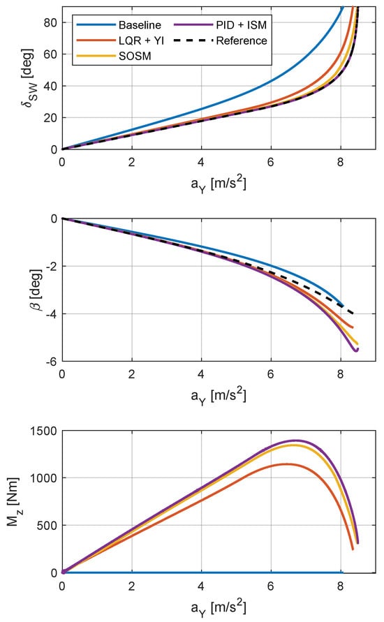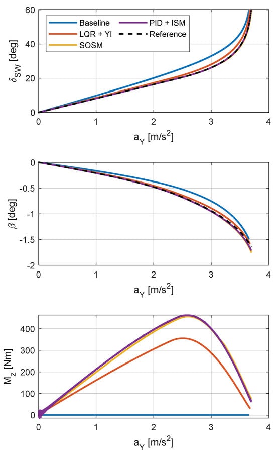 - increase in the maximum achievable lateral acceleration , maximizing the utilization of available tire–road friction. This objective is feasible because the maximum lateral acceleration occurs when the vehicle experiences a yaw moment, as detailed in the Milliken Moment Method (MMM) diagrams in [].