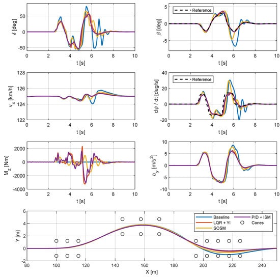 - Vignati, M.; Sabbioni, E. A Cooperative Control Strategy for Yaw Rate and Sideslip Angle Control Combining Torque Vectoring with Rear Wheel Steering. Veh. Syst. Dyn. 2021, 60, 1668–1701. [Google Scholar] [CrossRef]