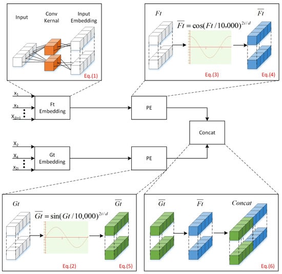 Segregation of the input into “gap” and “fill” components. Each component is subsequently subjected to conv1D transformation, resulting in the Lx×dmodel dimension. Following this, each component is individually combined with PE, and ultimately, the outcomes of both are concatenated to form INPUTE.