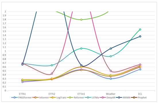 In this case as well, the individual methods were evaluated using the MSE and MAE metrics. All models were trained and tested on a single Nvidia 4090 GPU. The experimental results obtained are presented in Table 4. In order to show the comparison results more intuitively, Figure 5 is drawn according to the data in Table 4.