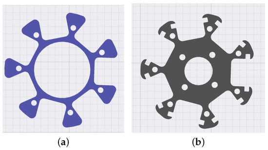In this case, the parameter R is set to mm []. Seven rollers for each wheel are needed, and the mechanical design is made in CAD. Each wheel has two side caps, one middle cap, rollers, shaft closure, spacer, and shaft coupling. The wheels were built with a 3D Printer ENDER 3 PRO with 180 mm/s printing speed, mm printing precision, and mm nozzle diameter []. The side caps design has to consider the shafts of the rollers (Figure 2a) and a middle cap inside of the wheel (Figure 2b); each wheel considers two side caps and is made with ABS plastic.