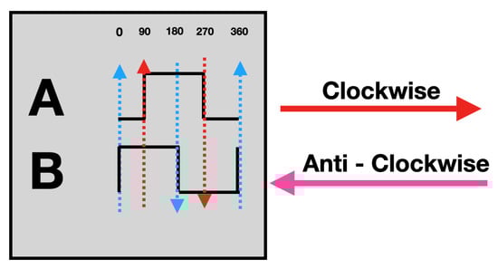 A sensor is required to determine the angular speed of the shaft. Therefore, an incremental rotary-type encoder indicates the motor shaft position, speed, and direction. The incremental encoder uses electrical pulse signals, channel A and channel B, to convert the rotation angle. The pulses of channels A and B depend on each other when the Arduino encoder rotates clockwise or counterclockwise, which is 90 degrees out of phase, as shown in Figure 9.