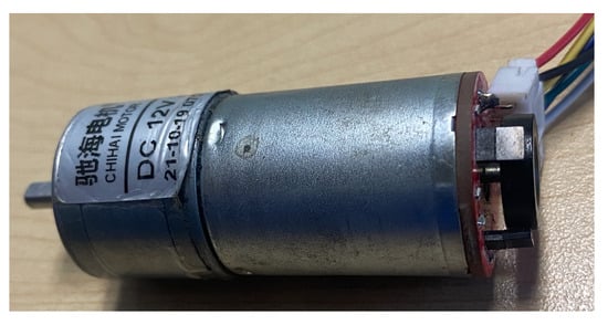 Depending on the objectives of the robot, different motor types can be used, such as stepper motors, BLDC motors, and DC motors. A low-cost, simple, and quickly widespread controlled motor consists of geared DC motors []. The proposed geared DC motors are from Chihai Motor, model (Figure 10). The selected motors operate at 12 V, with a rated speed of 350 rpm, a rated current of A, a rated load of kg·cm, and an average weight of kg. The reducer ratio of motors is about , and at each motor is coupled a rotary incremental encoder, as described above. These motors are powered independently by using an H-bridge motor driver, where these DC motors are commanded from a microcontroller.