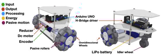 In this configuration, the chassis can be moved using the commonly low-cost yellow wheels with a radius of m, as shown in Figure 12. The horizontality of the robot is maintained through a commercial idler wheel type, which is set in the chassis to the necessary measurements for the robot, adapting the required height of installed wheels. Considering that the chassis was designed to be configured as an omnidirectional robot, the omnidirectional wheels, with a diameter of m, can also be used in the differential configuration, where two omnidirectional wheels can be installed in the motors’ shafts, as illustrated in Figure 13. The chassis was designed to rotate the motors until they obtained the required configuration. In this case, the axes of the motor shafts should be collinear between them, and the idler wheel has to be adjusted to the required height to ensure the horizontality of the mobile robot. In both assemblies, the instrumentation uses the same components to operate the robot, i.e., two DC-geared motors and one H-bridge motor drive as outputs, two encoders as inputs, one Arduino ONE board as the processing unit, and one external energy source. The only difference between them is the wheel type.