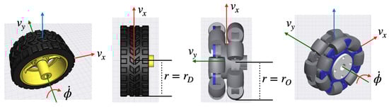 Due to this design being used in future mobile robots, omnidirectional wheels have been chosen []. The main characteristics of these wheels are summarized as follows: