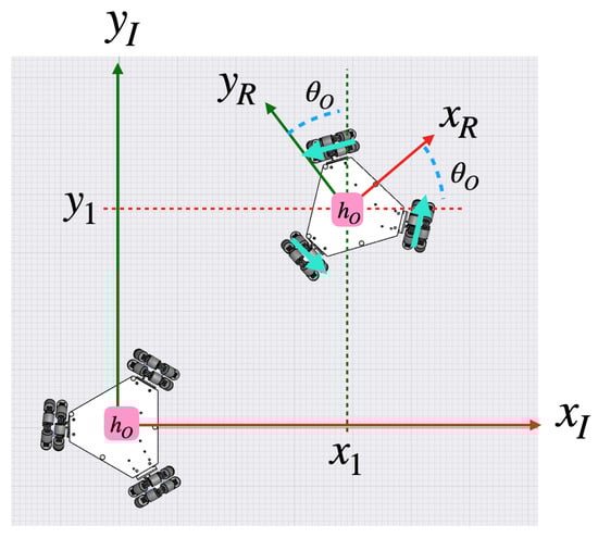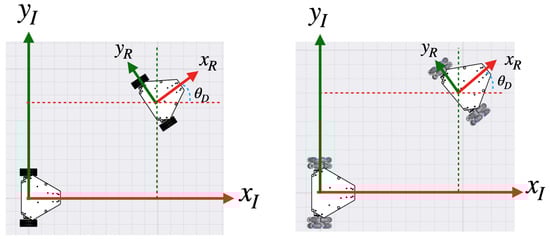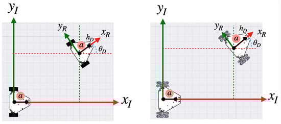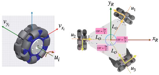 Assumption 2 can take much work to fulfill, especially when the two omnidirectional wheels are used. However, it is assumed that the motor shafts are collinear to ensure pure rolling motion; the wheel longitudinal velocity complies with the following equation