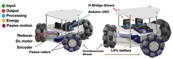 The development of mechatronic systems requires the collaboration of the mechanical, electronic, control, and software domains in a design team. The team can obtain the design and instrumentation by applying a mechatronic design strategy where mechanical, electronic, control, and computer engineering areas must collaborate to obtain a specific mechanism []. The typical approach is a sequential design, as shown in Figure 1. The physical system design is obtained in the sequential strategy before designing the control strategy. Later, the combined design is tested to ensure the robot’s functionality is simultaneously expected in design and control. This work implements this sequential strategy to design, instrument, assemble, and experimentally evaluate its performance by programming a middle-level controller. Furthermore, a mechanical design on the chassis is proposed in a way that the user can drive an adaptable or configurable robot design, i.e., it is possible to operate the robots in a configuration of a differential-drive robot or a configuration of an omnidirectional robot, with the same proposed mechanical structure.