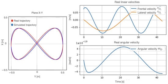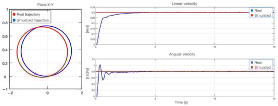 Note, that the real linear and angular velocities reach the desired linear and angular velocity at s. Nevertheless, it is worth pointing out that even though the real velocities converge to the desired ones, there is a displacement in the Cartesian trajectory. Based on the above-mentioned, it is clear that the tracking error has to be corrected, and the medium-level control (12) has to be implemented.