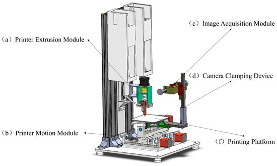 The model diagram of the system is shown in Figure 1. It contains a printer extrusion module, a printer drive module, an image acquisition module, a camera clamping module, and a printing platform, in which the camera in the image acquisition module is placed at an oblique angle to avoid interfering with the extrusion head of the printer, and the object being tested is in the printing platform. To ensure that the 3D printer can obtain high-quality images during operation, the camera should remain stationary relative to the printing platform. We designed a machine vision camera clamping device for 3D printers, as shown in Figure 1d.