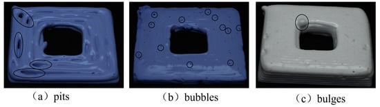 The image processing and defect detection module is the core of the whole detection system; its function is to carry out feature detection of the pre-processed image, according to the different features to determine whether there are form, size, or surface defects, and automatically distinguish the type of defects. This study categorized the defects into three main types of defects: pits, bubbles, and bulges, as shown in Figure 2.