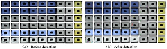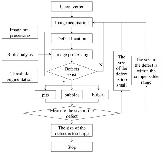 When the industrial camera acquires images, it will inevitably be disturbed by some signals and produce noise, so the acquired images need to be pre-processed to simplify the data, remove irrelevant information, and obtain reliable images [39,40,41]. The detection process is shown in Figure 3. Figure 3 is the framework flow chart of the overall visual inspection.