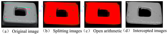 The target region can be obtained using the maximum interclass variance method, which is then processed using the open operation in morphology to smooth the edges of the image, eliminating burrs and narrow connections, but keeping the size of the ontological region unchanged. Finally, the target area is intercepted using the reduce_domain operator. As the industrial camera is placed at an angle in the inspection method designed in this study, the camera will capture images of both the upper and side surfaces of the printed part after printing a certain layer height, and the target area to be inspected can be effectively obtained using the maximum inter-class variance method, as shown in Figure 4.