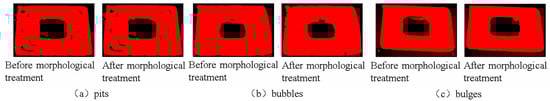 Then, morphological processing is required; expansion, erosion, open operations, and closed operations are the four basic operations of morphological processing [44]. Morphological processing is essentially a non-linear algebraic operation based on the shape of an object, which acts on point sets and the connectivity between point sets and shapes. Morphological processing is primarily designed to simplify image data by removing extraneous structures and allowing their underlying shape to be effectively preserved. The results of the morphological processing of the three defects are shown in Figure 5.
