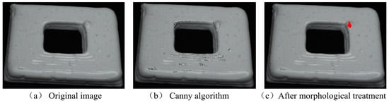 Before the threshold segmentation, according to the different characteristics of the defects, this study classified the defects into three types for segmentation: firstly, bulge and bubble defects because the bulge and bubble will produce a circle of gradient transformation in the grey value on the part surface. Hence, this study used the canny edge detection algorithm to detect the defects. The canny edge detection algorithm has the advantage of strong self-adaptation and can enhance the suppression of multi-response edges [45], as shown in Figure 6.