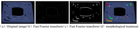 For pit defects, this study used the Fast Fourier Transform to detect defects [46]. The usual calculations are carried out in the spatial domain. Still, sometimes the processed effect in the spatial domain cannot achieve the desired effect, so the fast Fourier transform can be used to convert the target into the frequency domain space. Then, the reverse Fourier transform can be performed in this space for subsequent processing after the processing is completed. The processing is completed, followed by mean filtering and dynamic thresholding to segment out the defects and finally, morphological processing is performed to obtain the desired image, as shown in Figure 7.