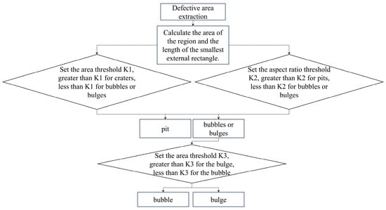 The process of distinguishing between different types of defects based on their distinct properties and the outcomes of image processing is known as defect recognition [47]. After identifying the defective area, it is also necessary to distinguish the three kinds of defects again, and the flowchart of the identification of the three kinds of defects is shown in Figure 8.