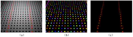 In the defect detection system designed in this study, the camera is placed at an angle, which leads to near large and far small dimensional errors in the two-dimensional plane, and the conventional distortion correction method is not sufficient to solve this problem, and thus a new method is also needed. A plane plate with 20 × 20 dots is generated and printed out, and the plate is placed on the printing platform, with the bottom of the plate parallel to the camera; the camera then captures an image, as shown in Figure 5, Figure 6, Figure 7, Figure 8 and Figure 9a. After the aberration correction, the image is preprocessed first, and the region of dots is segmented, and then two columns of dots are selected as identification points, and the pixel distance between them and one column of 18 and the actual distance are calculated, respectively. It is known that the theoretical distance should be 70 mm, and the converted actual distance and the theoretical distance are compared to this, as shown in Figure 9c, and the two groups of identification points are selected.