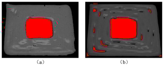The theoretical model features and printed detected defects are shown in Figure 10 when this model is printed. Among them, the red-filled part of Figure 10b indicates the detected defects. In this study, the defects are mainly characterized by parameters such as center coordinates, aspect ratio, and area.