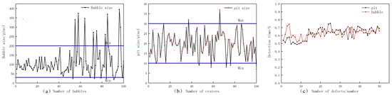 Since there were fewer bulging defects, 100 detected pit defects were randomly selected to detect the size of the width of the pit in pixels, and 100 bubble defects were randomly selected to detect the size of the area of the bubble in pixels; the experimental results are shown in Figure 13a,b.