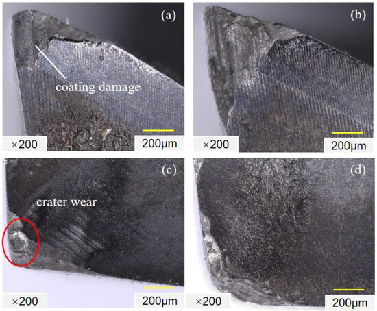 Tool wear of AlCrN-coated carbide tools: (a) 10 min flank wear; (b) 20 min flank wear; (c) 10 min rake wear; (d) 20 min rake wear.