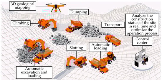 Specifically, Figure 2 shows a schematic diagram of the intelligent construction topology of the unmanned excavator. The intelligent construction technology of the unmanned excavator integrates advanced 3D terrain scanning, automatic elevation angle adjustment, real-time construction monitoring and analysis, and the ability to work in collaboration with autonomous transport vehicles. These technologies enable excavators to accurately perform excavation, loading, and transportation tasks, optimize construction processes, and improve operational efficiency, while reducing manpower requirements and operational risks, providing an efficient, safe, and environmentally resilient solution for modern engineering and construction.