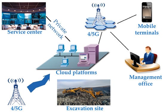 Wireless communication technology plays a vital role in optimizing workflows, increasing efficiency, and reducing costs. Figure 3 shows the overall communication scheme. It covers five objects, including the mining process operation site, the cloud platform, the company’s service center and the user, and the operation equipment uploads the relevant parameters to the cloud platform through the base station network. The cloud platform calculates and stores the model, displays the data on the monitoring screen of the operating equipment, and transmits it to the user and the company’s internal platform at the same time to achieve a full range of management functions.