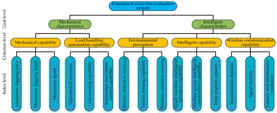 For the comprehensive evaluation of unmanned excavators, the hierarchical model used in this study is divided into three levels:
