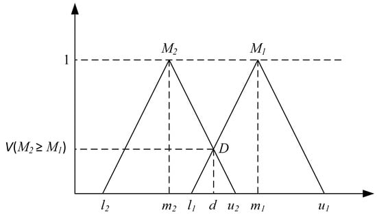 Evaluate the degree of possibility for , fuzzily restricted to belong to M, to be greater than fuzzily restricted to belong to M. The degree of possibility is defined as shown in Equation (4):