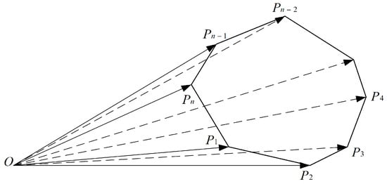 where Ω is an n-edge polygon with vertices aligned positively along the boundary. The coordinates are in order: . S creates a vector diagram of the area of the polygon of Ω. From Figure 6, it can be seen that the coordinate origin and any two adjacent vertices of the polygon form a triangle, and the area of the triangle can be obtained from the outer product of the two plane vectors formed by the three vertices.
