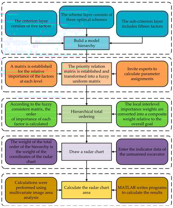 This can verify the validity and feasibility of the evaluation method in this study. The fuzzy analytic hierarchy process method can deal with the ambiguity and uncertainty between evaluation indicators. Through expert opinion and fuzzy mathematics operations, the subjective evaluation can be transformed into relative weights, and the indicators can be divided and ranked hierarchically. This method can provide more objective and scientific evaluation results. Compared with the traditional subjective evaluation method, the fuzzy analytic hierarchy process method introduces the concept of fuzzy mathematics into the evaluation process and pays more attention to the accurate assessment of the weight and importance of each evaluation index. It can help decision makers better clarify the evaluation hierarchy and avoid subjective bias and unreasonable weight settings. The multivariate image area analysis method can intuitively display the comprehensive results of multiple evaluation indicators. Drawing radar charts and graphically displaying the evaluation results of different indicators can help to quickly compare and understand the comprehensive performance of different unmanned excavators and discover their strengths and weaknesses. Compared with the traditional evaluation methods of weighted average or weighted sum, the multivariate image area analysis method pays more attention to the comprehensive analysis and comparison of multiple indicators. It can highlight the performance of different excavators against different indicators and provide an intuitive graphical display to facilitate the judgment of decision makers.