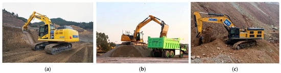 Various models of unmanned excavators: (a) Komatsu PC210LCi-11; (b) LIUGONG 922F; (c) XCMG XE950DA.