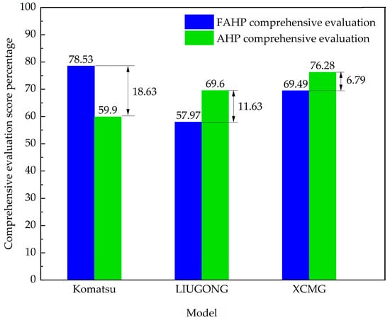 As shown in Figure 10, in the evaluation process of the three unmanned excavators of Komatsu, LIUGONG, and XCMG, it can be concluded that there is a difference between the evaluation results of the traditional evaluation method AHP and those of the evaluation method FAHP of this study. The results of the traditional evaluation method AHP are Komatsu PC210LCi-11 scoring 59.9 points, LIUGONG 922F scoring 69.6 points, and XCMG XE950DA scoring 76.28 points. The evaluation results of the evaluation method FAHP in this study are 78.53 points for Komatsu PC210LCi-11, 57.97 points for Liu Gong 922F, and 69.49 points for XCMG XE950DA. According to the comparison of actual analysis and evaluation results, Komatsu PC210LCi-11 has better comprehensive performance, which shows that the evaluation method of this study is more comprehensive and reasonable.