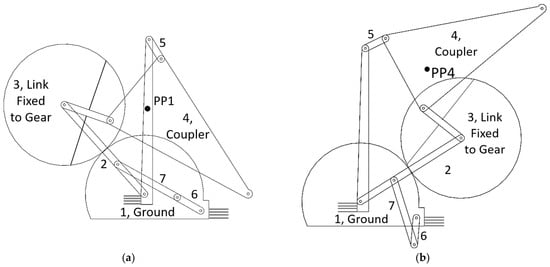 An example of a 7-bar-geared linkage mechanism depicted in two positions, synthesized for motion generation with prescribed timing. The gears are affixed to link one (ground) and link three. The mechanism was designed as a base five-bar-geared mechanism, and a driving dyad was added to constrain the motion of the rocker input. By driving link 6, this dyad protects the mechanism against possible branch defects at the fringes of the rocker’s range of motion. (a) a depiction of the mechanism in its first position. (b) a depiction of the mechanism in its fourth position.