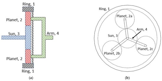 Traditional gear trains also abound in the literature. A typical one is shown here. Though gear trains are not the emphasis of this paper, a planetary gear train like this one may be a useful addition to modulate the torque of a geared planar linkage mechanism. (a) A side view of an epicyclic gear train. Note that while both the planets are labeled link 2, they are separate elements, as seen in Figure 3b. (b) A front view of an epicyclic gear train.