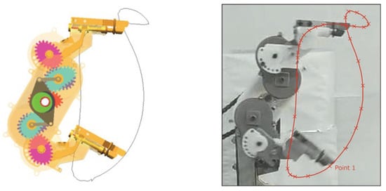 These previous examples assume a circular gear profile, but non-circular gears have been used creatively, and some impressively complex motions can be achieved with these gears [,]. The methods are quite clever, taking advantage of the inherent two degrees of freedom of a planar five-bar to precisely control two inputs at once using the non-circular profile of the gears. With that said, non-circular gears tend to be far less practical to manufacture, requiring a special custom order that is substantially more costly and can only be operated at low speeds due to potential vibration issues. Sun et al. demonstrated a procedure for using graph theory to identify non-circular gear profiles to synthesize a GPLM. Their method was applied to the design of a transplanting mechanism, the results of which are seen in Figure 6 []. Transplanting in agriculture is a delicate process, as young plants tend to be quite fragile, but if performed properly, it is quite useful, as the plants can be germinated in a protected environment before being transferred to a field. Yao and Yan introduced a new algorithmic approach for optimizing the profiles of non-circular gears [].