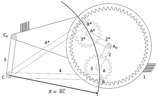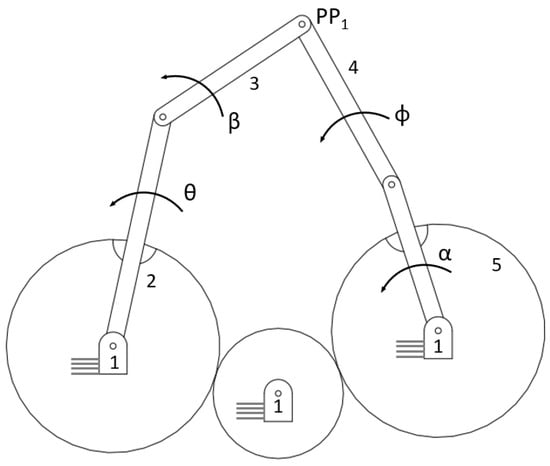 - Rao, A.V.M.; Sandor, G. Extension of Freudenstein’s Equation to Geared Linkages. J. Eng. Ind. 1971, 93, 201–210. [Google Scholar] [CrossRef]