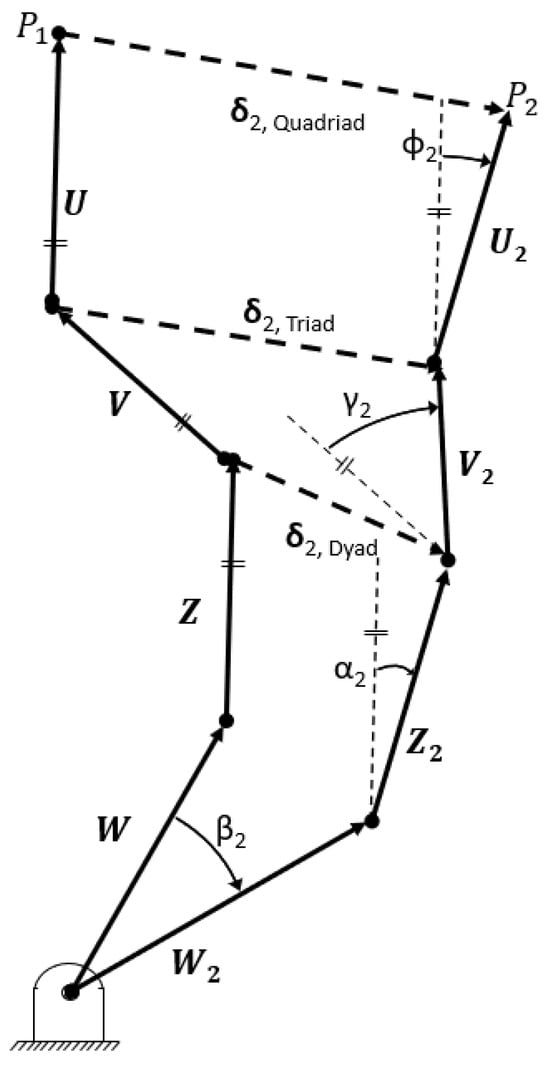 A vector forms the depiction of a quadriad chain with intermediate chains labeled. A triad chain does not include the U vector, while a dyad chain does include either the U or V vectors. The quadriad chain is depicted in an initial position and a second position resulting from the rotations β2, α2, γ2, and ϕ2. Note that the vector δtriad in this figure is equivalent to the vector δ2 in Equation (2). Figure 10 reveals how Equation (2) might be reformulated for quadriad or dyad chains, as shown in Appendix C.