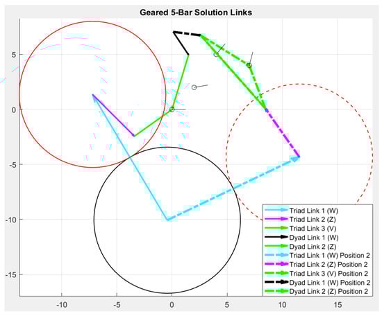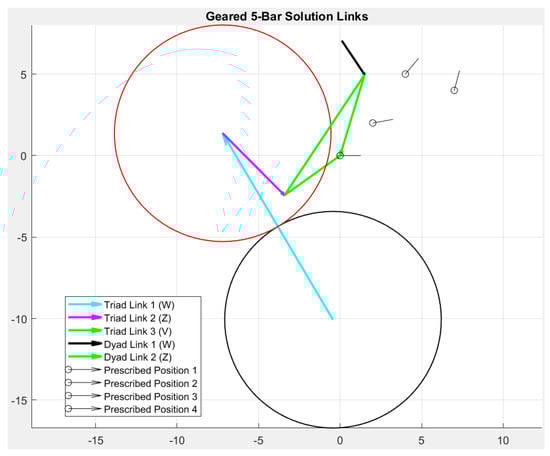 While the triad in four positions has three vector equations and three unknowns, the dyad in four positions has two vector equations and six unknowns (vectors W, Z, and angles β3 and β4). As a result, here, the compatibility linkage technique is employed to determine the dimensions of the dyad. The compatibility linkage is a mathematical technique that makes it possible to find exact solutions to the standard form equations despite having more unknowns than equations and is covered extensively in the existing literature [,,,,]. Using this technique, the designer has one free choice available to them, which is selected as the angle β2 and set as 205.35°.