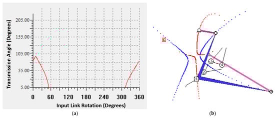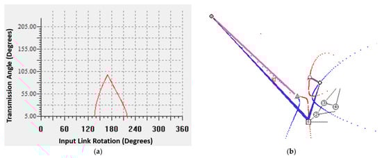 A candidate four-bar linkage designed with the same set of prescribed positions. (a) The transmission angle data of the four-bar linkage throughout its range of motion. (b) A visualization of the synthesized four-bar linkage, including the prescribed positions and Burmester curves.