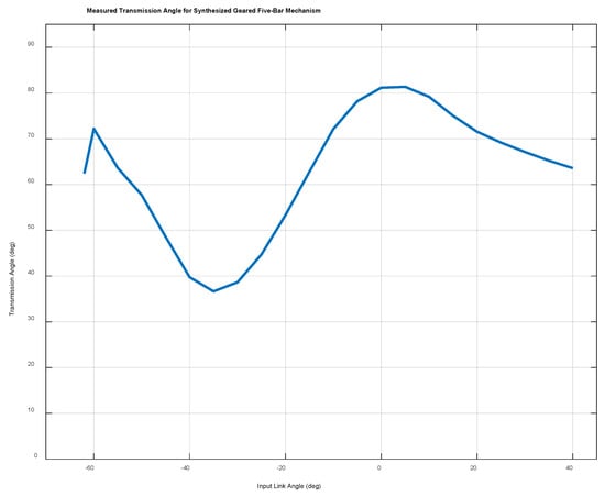 The transmission angle data throughout the full range of motion of the synthesized geared five-bar mechanism.
