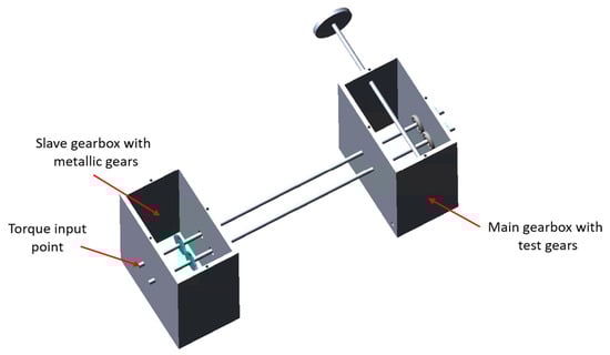 The test bench, developed in collaboration with an EU automotive component manufacturer, falls into the category of mechanically loaded closed-loop test benches and draws inspiration from the work of Professor Kun Mao and Professors D. Walton and CJ Hooke of the University of Birmingham []. The aim was to design a test bench capable of measuring the wear on the surface of a plastic gear subjected to constant loading conditions. In the initial design phase, it followed the guidelines provided in [], proceeding to create a closed-loop test bench, the initial basic schematization of which can be observed in Figure 1.