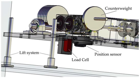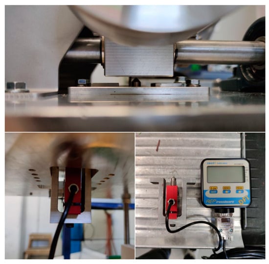 In Figure 5, the position of the load cell used for weight measure (torque) before the test is shown. Because the range of torque (from 0 to 2.25 Nm) needs to be tuned with extreme precision, a counterweight mass was added to the system (not present in the original test bench) with a short distance to the rotation pin to be very effective in fine-tuning the system. These first modifications are essential and indispensable for a correct measurement of the quantities involved.